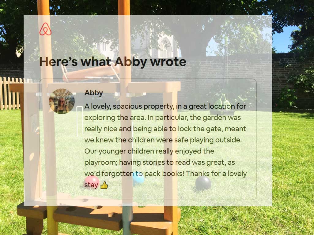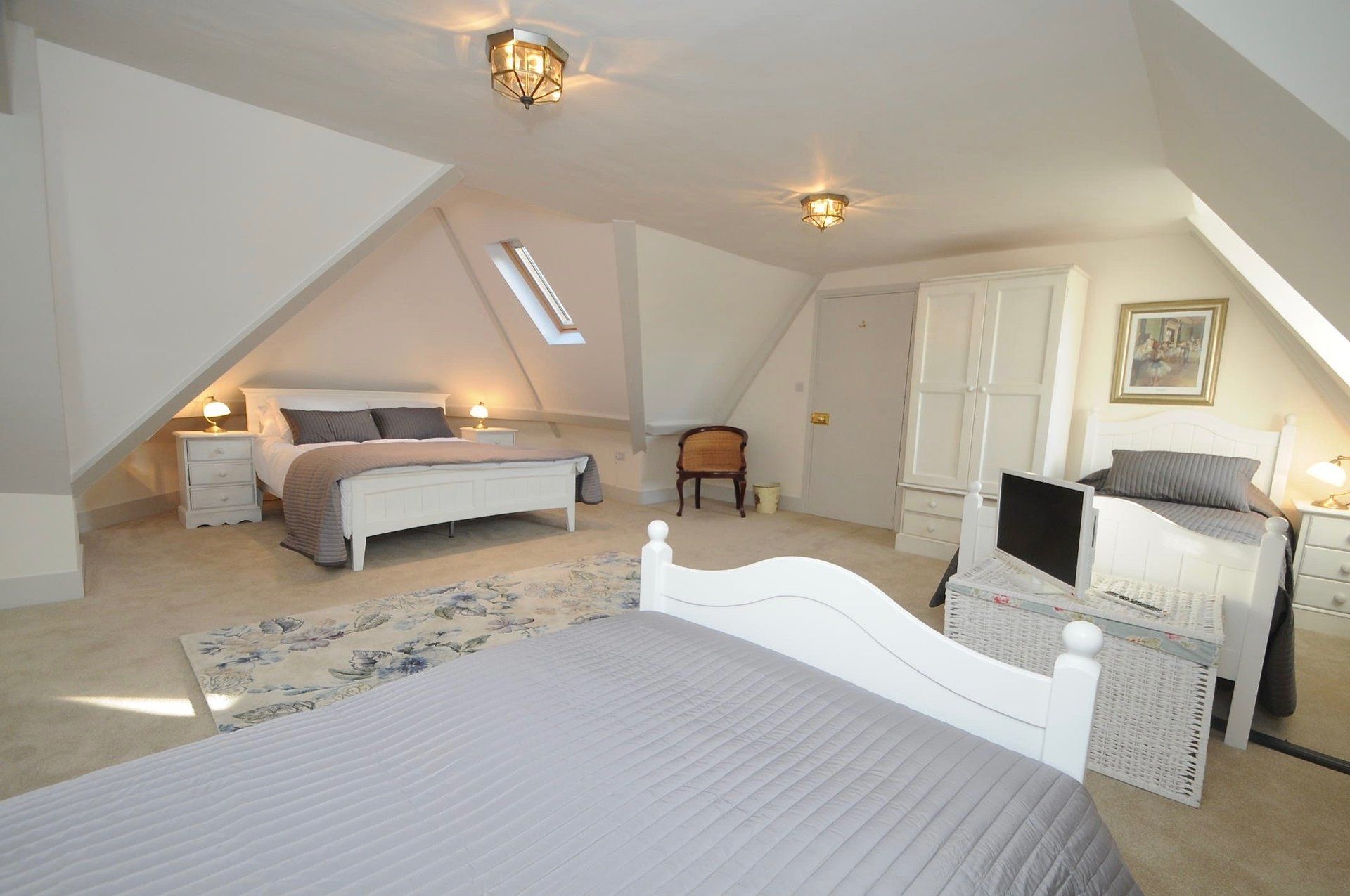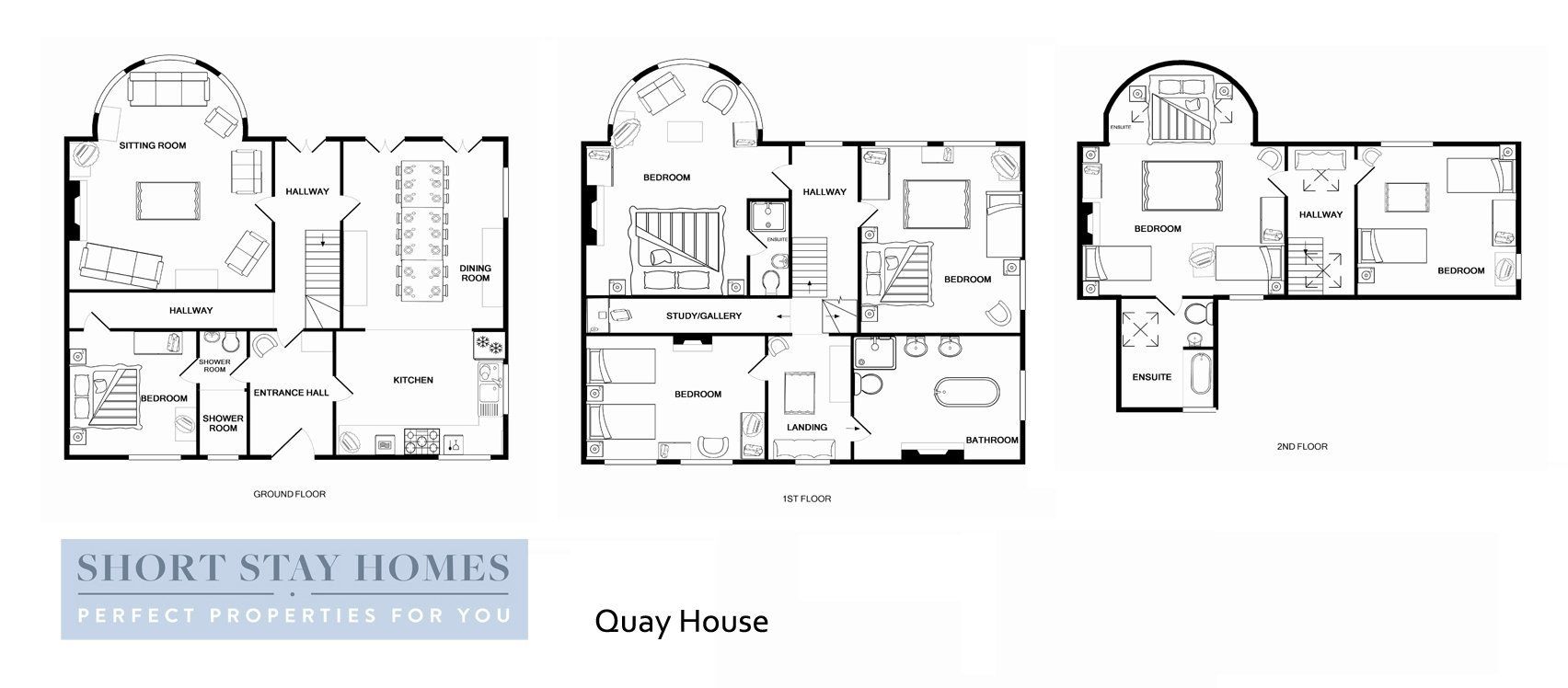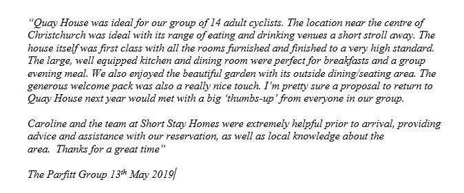 The former vicarage, now called Quay House, has 6 bedrooms and 4 bathrooms and off street car parking for up to 4 cars. There is also a large garden, which is rare for such a central location, with tables and seating for up to 15. The property has a large, bay windowed, lounge with 60” TV (plus Virgin media) that can seat up to 15 and an extensive kitchen diner than runs across the whole width of the house and can again seat up to 15 around a single table. The master bedroom has a super king-size four-poster bed and its own ensuite and seating area, within the large bay window.